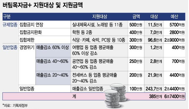 소상공인 385만명을 대상으로 4차 재난지원금 `소상공인 버팀목자금 플러스(+)`가 지급된다. 기존 정부가 정한 5종에서 7종으로 지원 유형을 세분화해 총 6조7천억원이 1인당 100만~500만원으로 차등