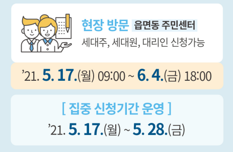 현장방문 신청은 5월 17일에서 6월 4일 주소지 읍면동 주민센터를 방문하여 신청할 수 있습니다. 현장방문 신청은 세대주, 세대원, 대리인 모두 신청 가능합니다.