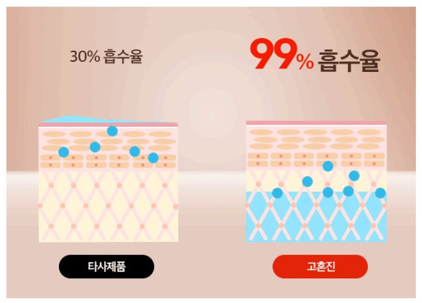 주요 성분이 특허추출물로서 피부 장벽 강화와 안티에이징 효과를 극대화 시켜줄 수 있으며, 피부 미백과 보습에도 도움을 주며 기존 화장품이 20~30% 흡수율에 불과한 반면 고혼진의 경우 세분화 입자를 99% 피부 진피층까지 흡수될 수 있다는 점이 특징입니다.